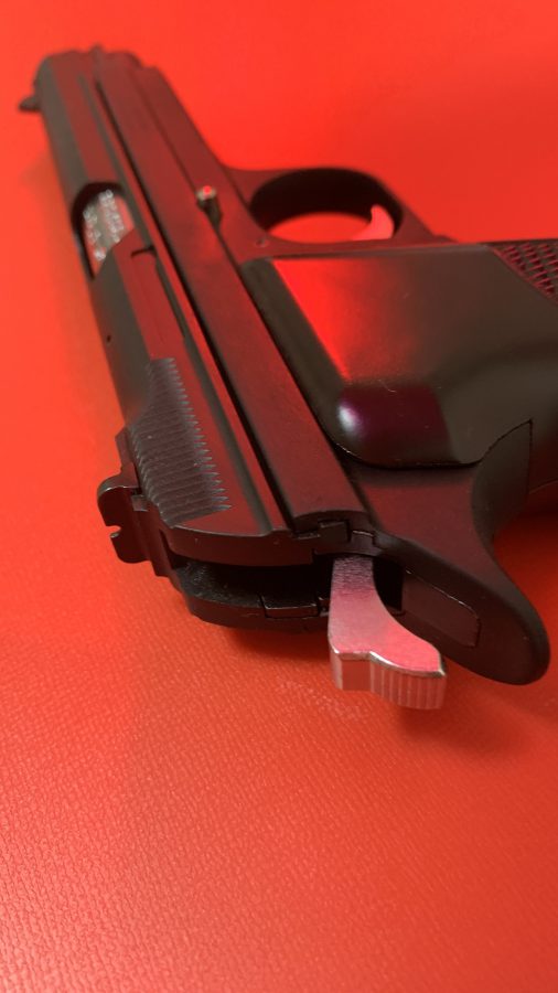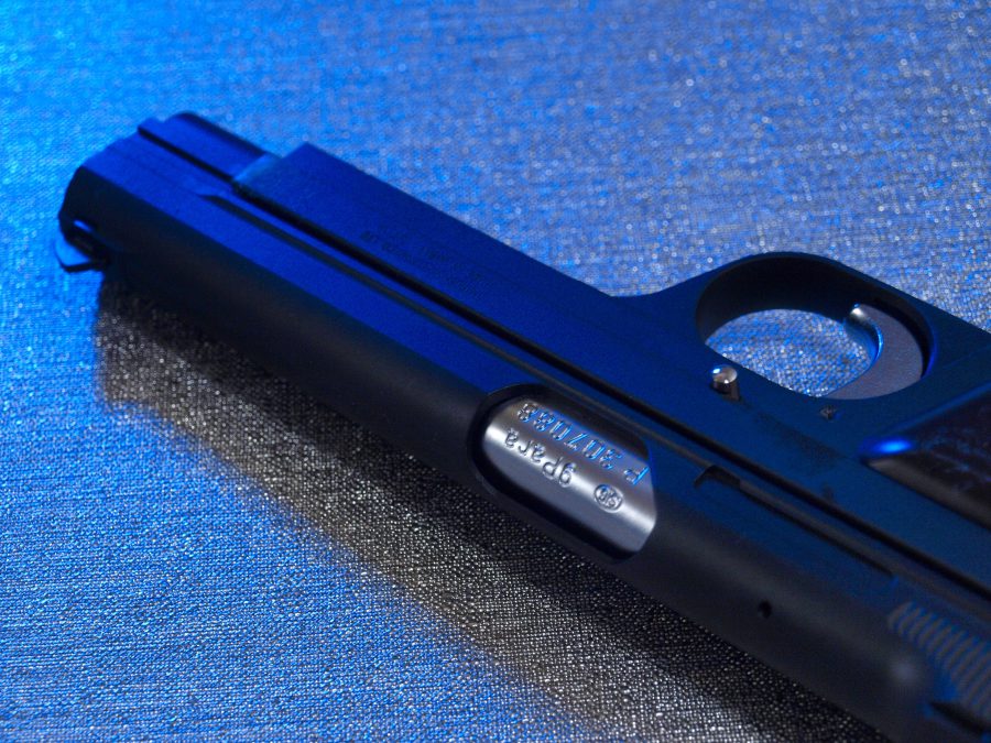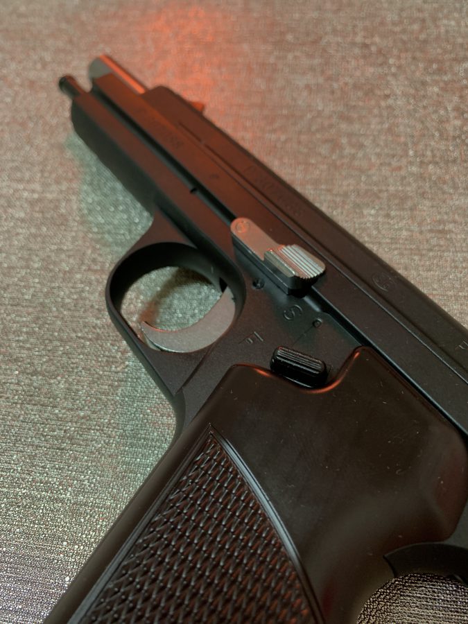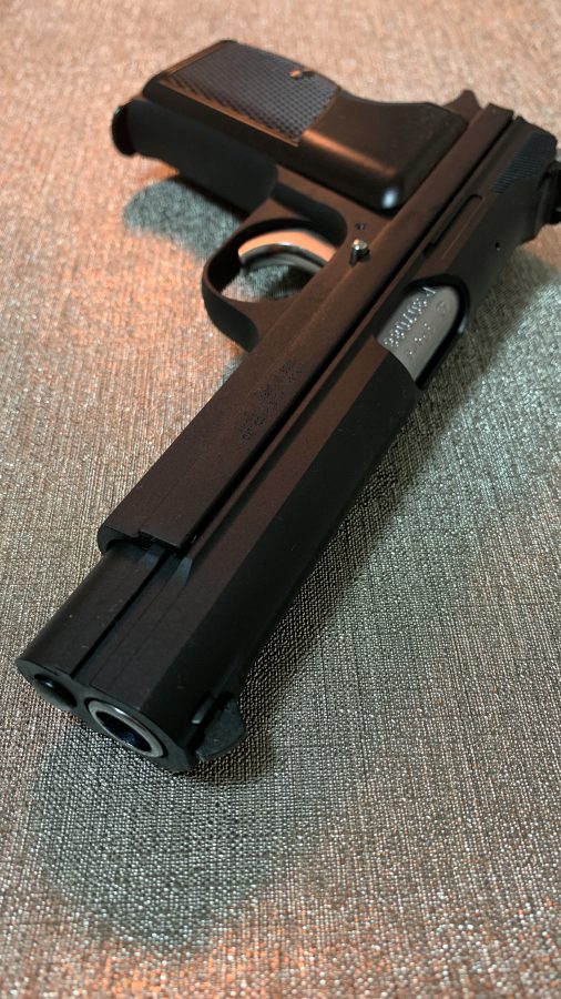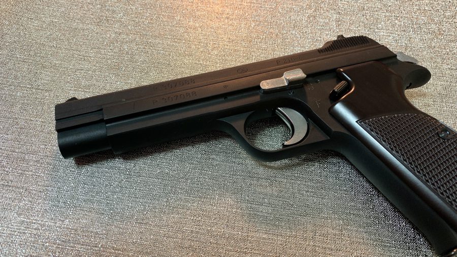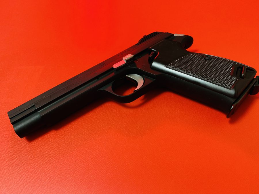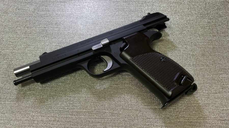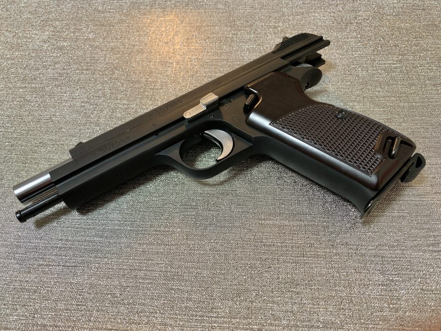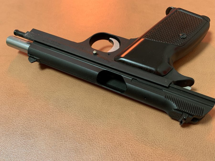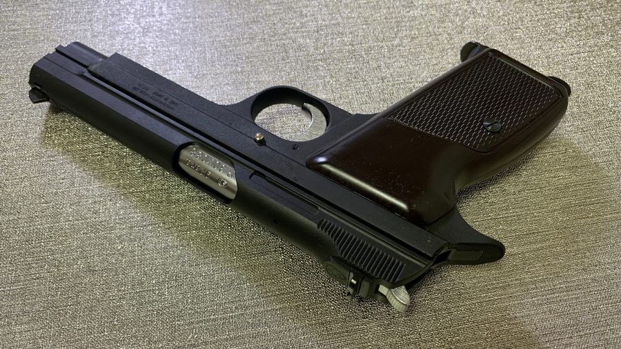 シングルアクション、シングルカラムのシンプルで美しい銃。フレームの方がスライドを包み込む構造は後のCZ75と同じ構造。