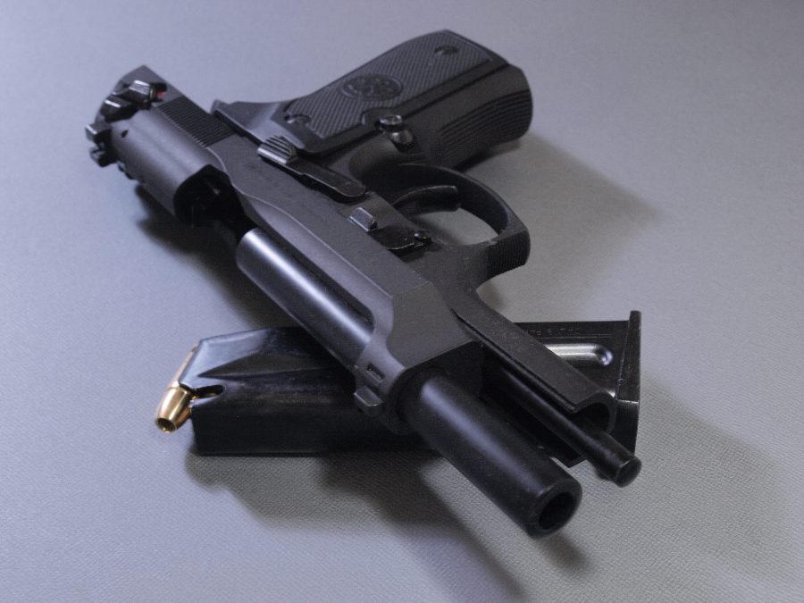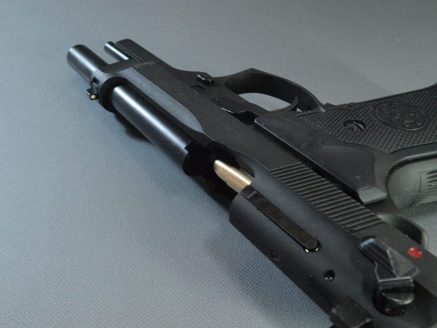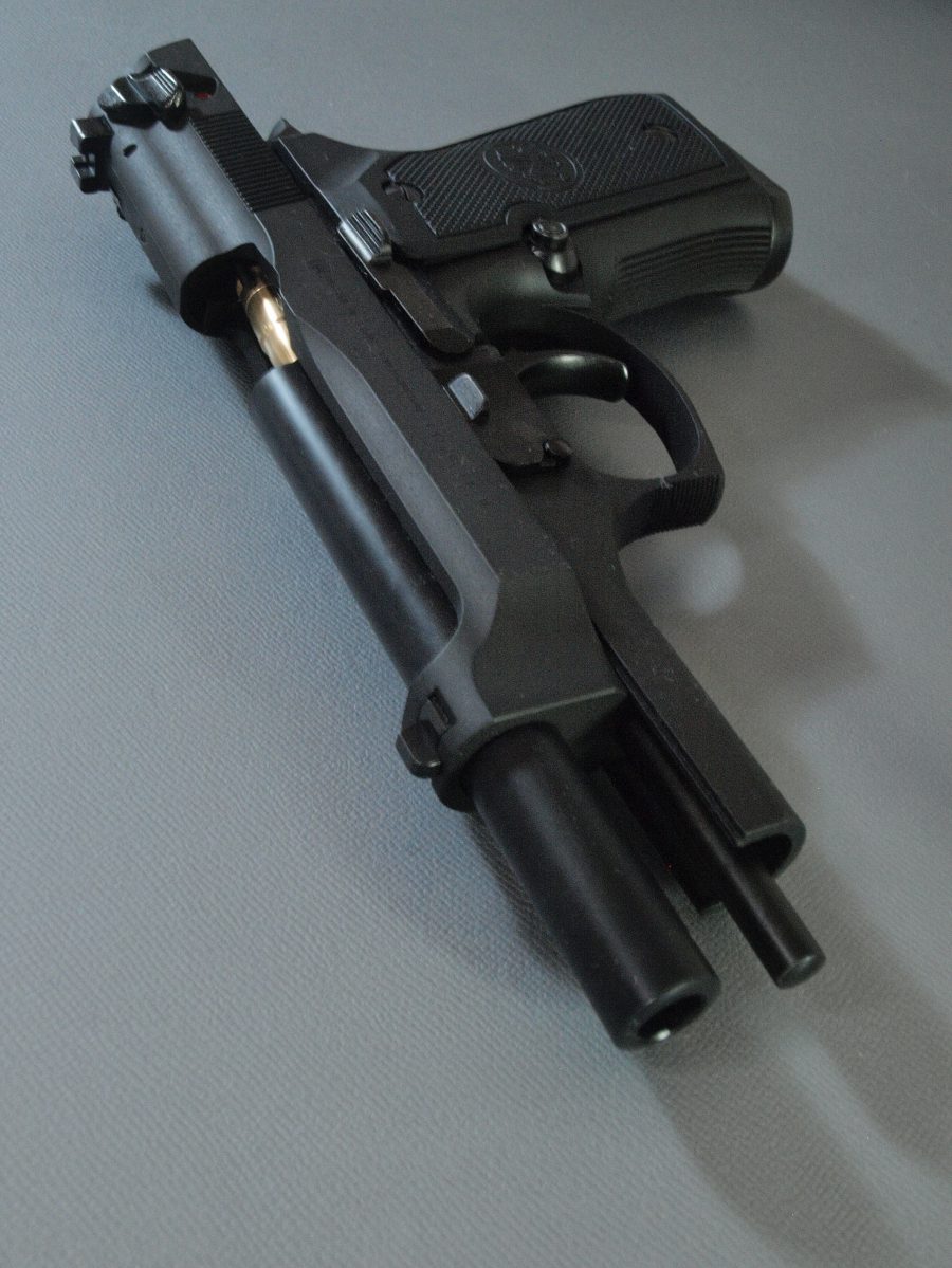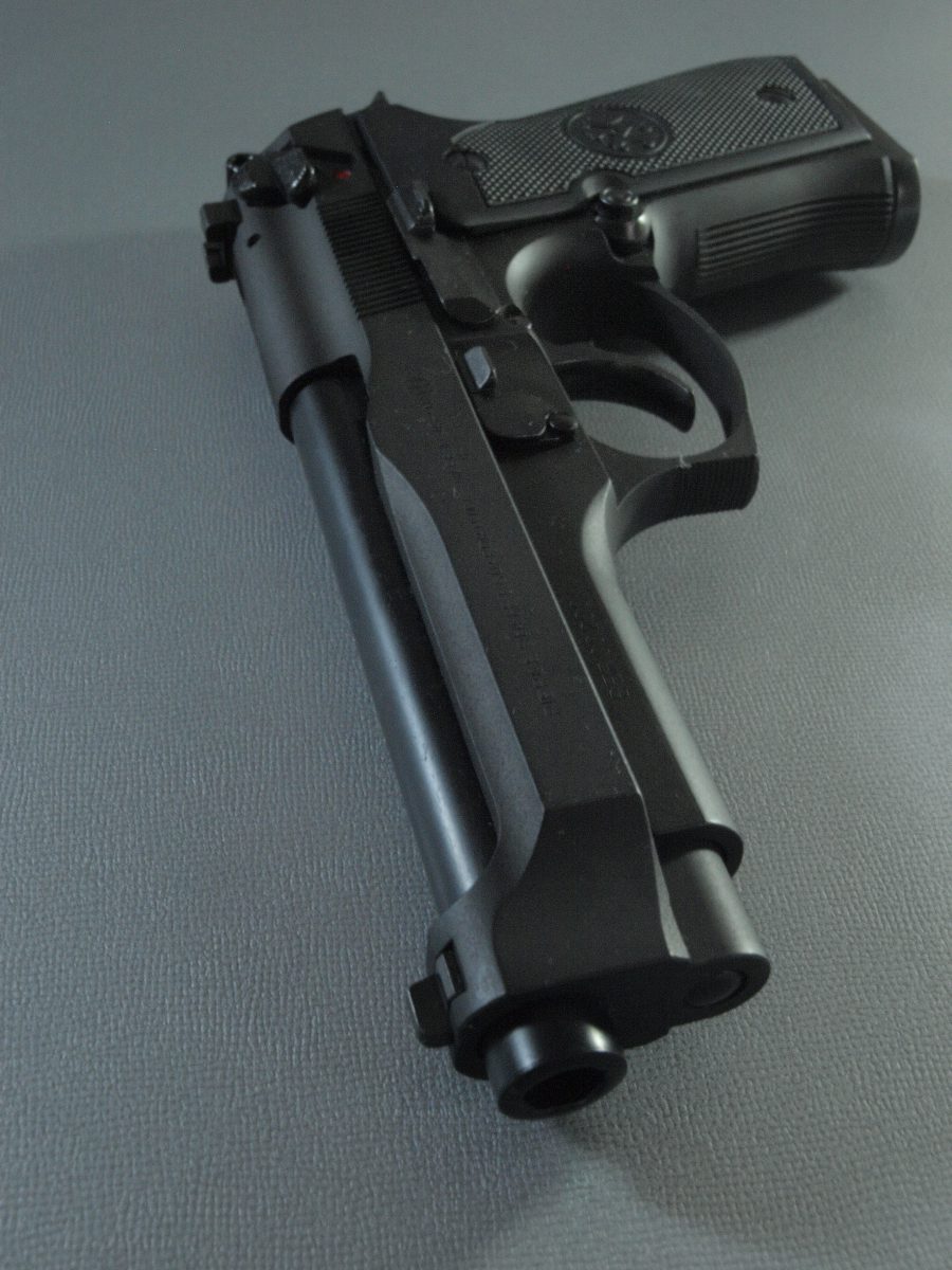 マルシン工業製モデルガン、ベレッタ92。強装弾に対応するべくスライドの中央を盛り上げたブリガディアと呼ばれる強化スライドを再現したモデル。